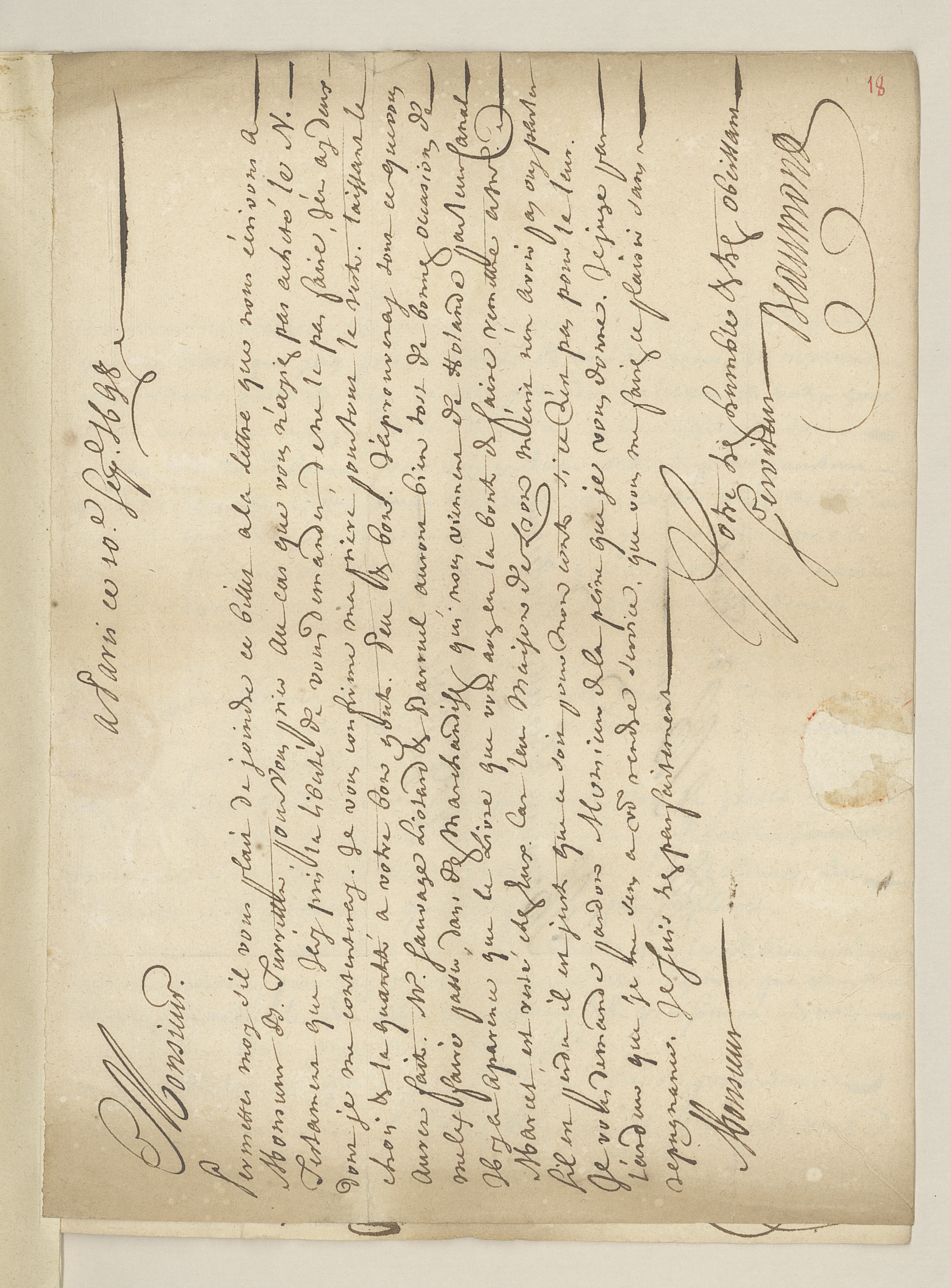 - Beaumont confirme à JA la liste de livres qu'il lui a demandée d'acheter [La Placette, <I>Morale</I>; Abbadie, <I>Traité de la vérité de la religion chrétienne</I>] sauf pour le Nouveau Testament; il en a déjà deux et ils lui suffiront. Il pourra se servir de [Jean (?)] Sauvage, [Antoine (?)] Liotard et Barruel qui auront bientôt l'occasion de les faire passer dans des marchandises qu'on attend de Hollande. Pour le livre que JA a envoyé par Marcet, il semble qu'il soit resté chez lui puisque la maison de Lyon n'en a pas entendu parler.
