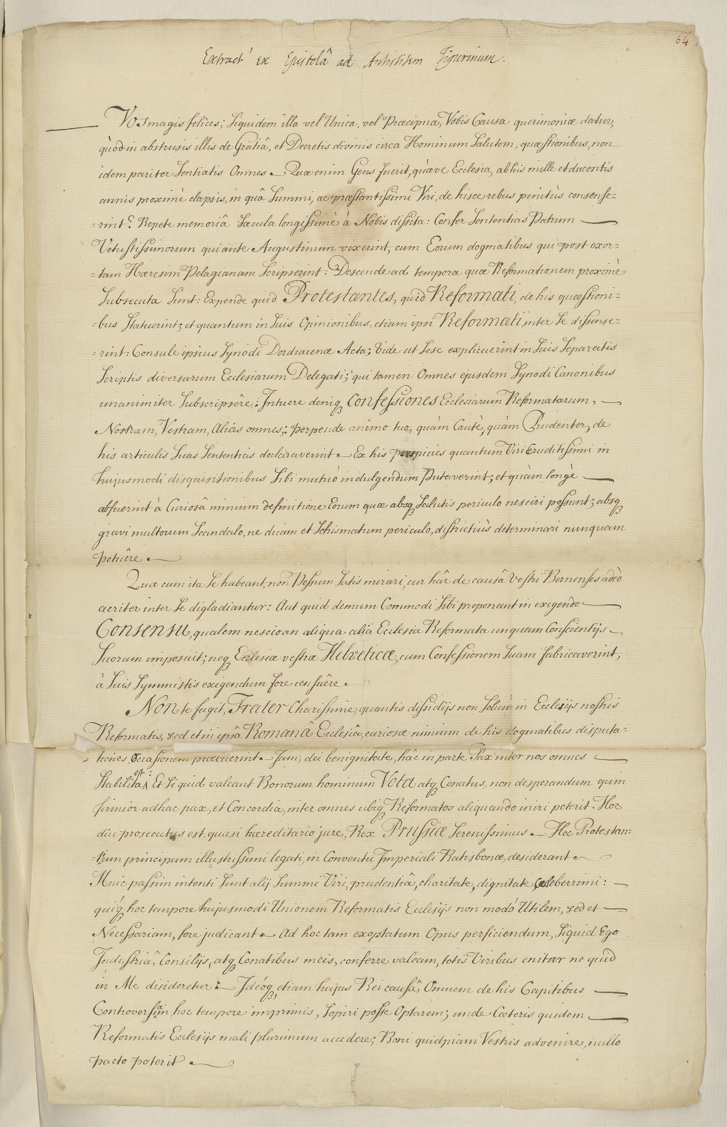- Wake envoie à JA la réponse qu'il a faite à une lettre qu'il a reçue de Zurich et qui était signée par les pasteurs et professeurs de cet État-là; il lui envoie aussi la partie d'une autre lettre qu'il a adressée à l'antistès de la même ville [Johann Ludwig Nüscheler] pour les ministres des autres Églises en Suisse. Dans la réponse à l'antistès, Wake a pu aborder naturellement la question du <I>Consensus </I>puisque son interlocuteur y avait fait référence dans sa lettre. C'était en revanche plus difficile de justifier son intervention dans l'autre réponse puisque ceux qui lui ont envoyé la lettre ne lui ont pas offert d'opportunité de traiter de ce sujet. Il compte sur la prudence et l'amitié de JA pour que la longue lettre qu'il lui a envoyée sur le même sujet ne lui porte pas préjudice auprès des frères à Genève comme en Suisse. L'antistès a permis à Hofmeister de citer dans son discours et même d'imprimer certains passages d'une des lettres que Wake lui avait envoyées, ce qui a causé pas mal de problèmes puisqu'il faisait état de la situation de l'Église d'Angleterre; son récit était digne de foi mais assez mélancolique et, surtout, il évoquait plusieurs personnes, entre autres du clergé, qui occupent un rang important. C'était très imprudent, pour ne pas dire plus; c'est en effet suspect dans la mesure où cela vient de l'un des plus chauds partisans du <I>Consensus</I>. Wake recommande à JA les deux jeunes voyageurs, en chemin de Paris à Genève: l'un est le fils [Paul (?)] de leur ami commun [Daniel Ernst] Jablonski, l'autre est [Emericus Pariz (?)] Papay, un délégué des frères de Transylvanie venu faire une collecte pour le collège d'Enjedin (?). Les réticences de Wake à l'égard de l'usage qu'on a fait de sa lettre à l'antistès ne concernent guère JA puisque dans la lettre qu'il a envoyée à ce dernier il n'y a rien qui touche des personnes vivantes.